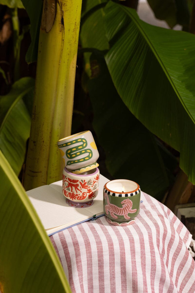 8 oz ceramic candles with hand-painted details have been filled with bold fragrances to match the imaginative design and ignite your senses.